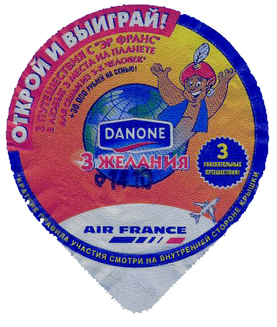 Соберите 3 крышки, с изображениями на внутренней стороне Джина , надписи DANON, и надписи AIR FRANCE по 1-му изображению на каждой крышке, вложите в конверт вместе с письмом в котором укажите свою Фамилию Имя Отчество, домашний адрес с индексом, контактный телефон, и пошлите по адресу: 117168, г.Москва, ул.Кржижановского, 14/1 (только до 15.12.1999 г.)